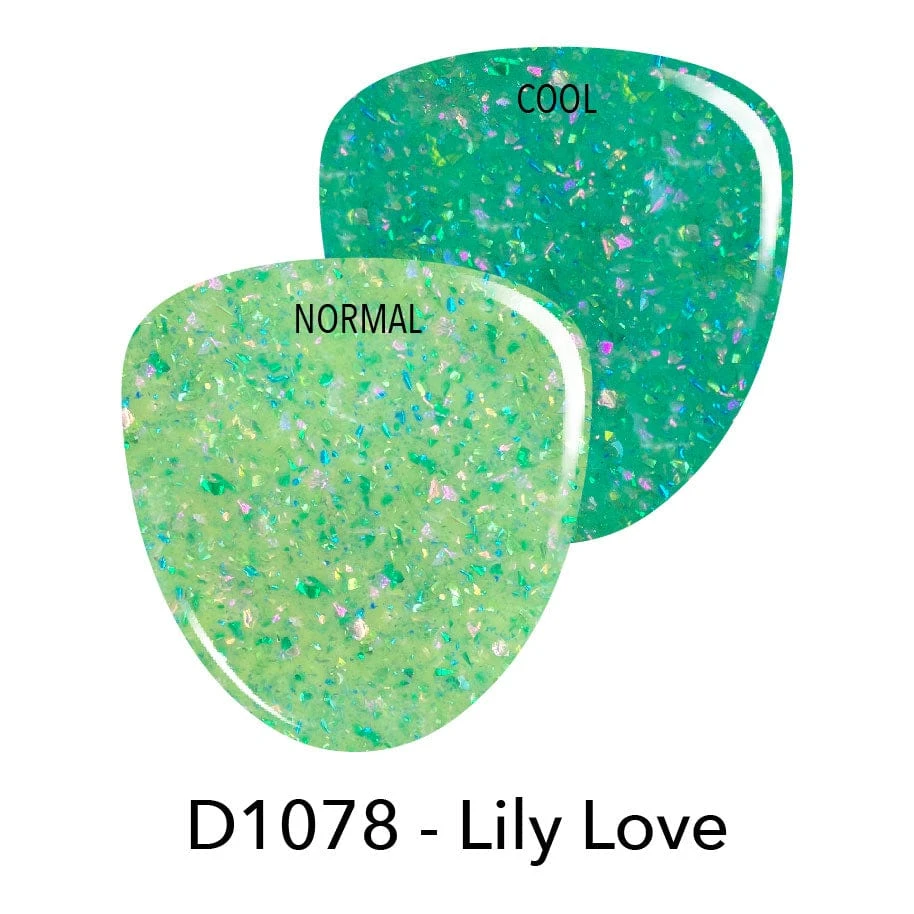 Lily Love is a light green base with green, blue and iridescent flakes whose base changes to a teal blue when cold.