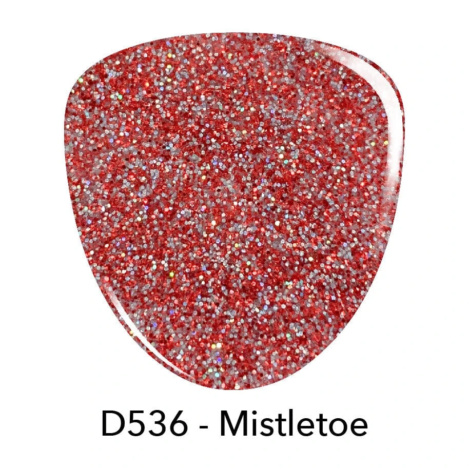 Mistletoe is a red glitter base with tri-color gold, green, and purple glitter.