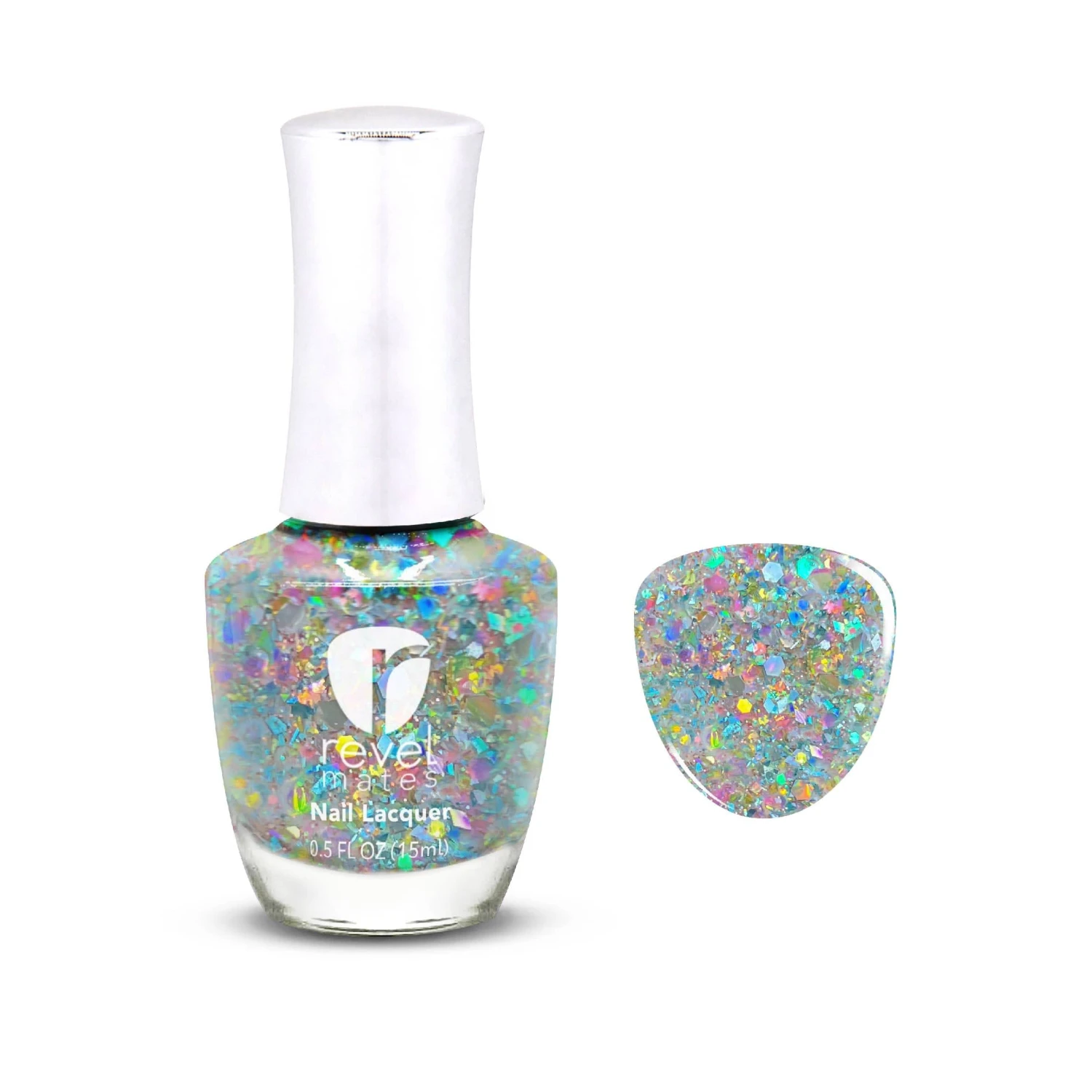 Leave a sparkle wherever you go with….D675 Whimsy! Whimsy is a clear base with various sizes of holographic glitter. Mates come in a 0.5 oz bottle only.
