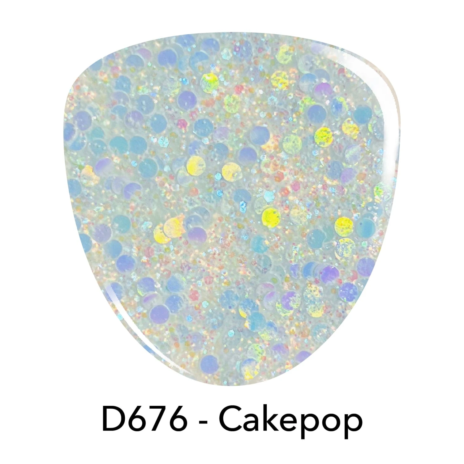 D676 Cakepop is a clear base with iridescent glitters and large circular blue glitters on top.