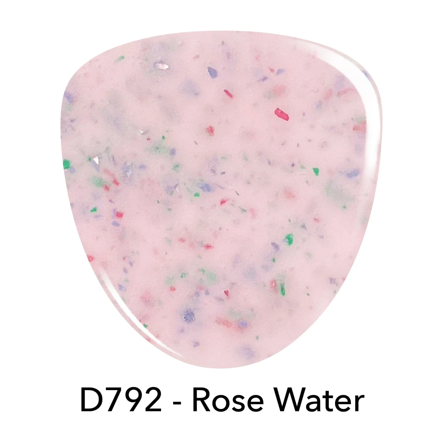 Rose Water has a baby pink base with fuchsia, purple and green flakes.