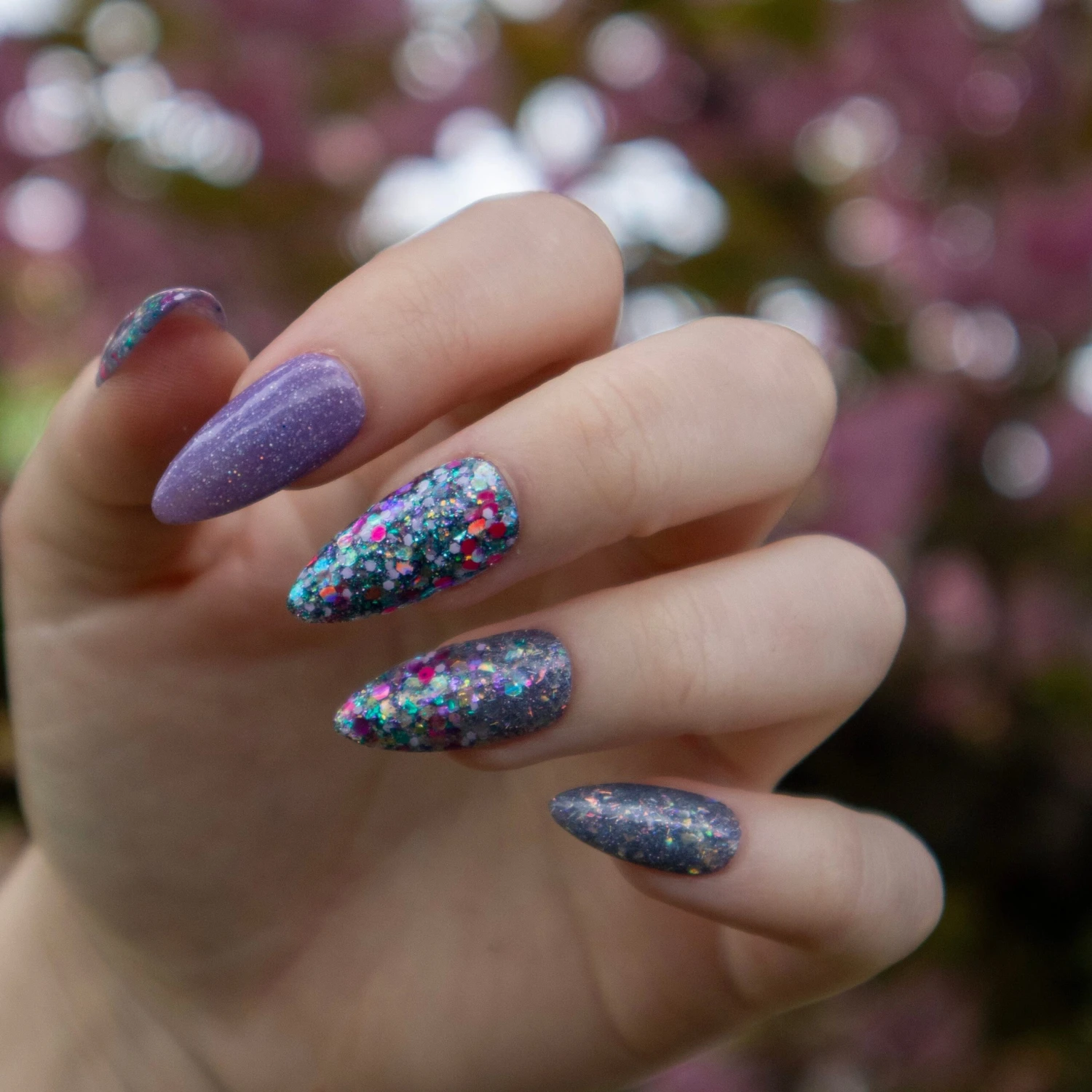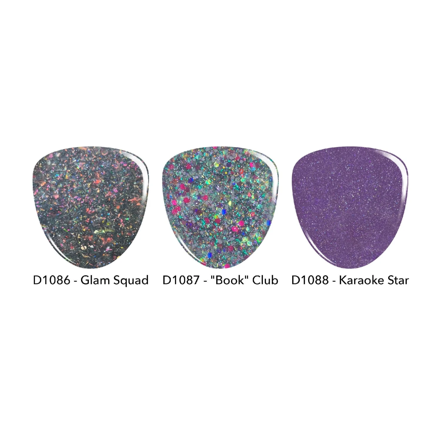 - D1086 Glam Squad is a blueish-purple glitter base with holographic and iridescent glitters and flakes. Glam Squad can be chromed for a subtle blue pearl effect.