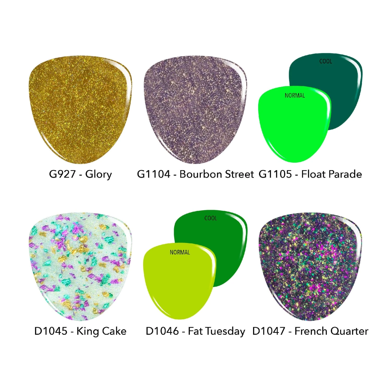 - D1045 King Cake: King Cake is a sheer base dip powder with small glitters and big purple, green and gold metallic flakes.Â