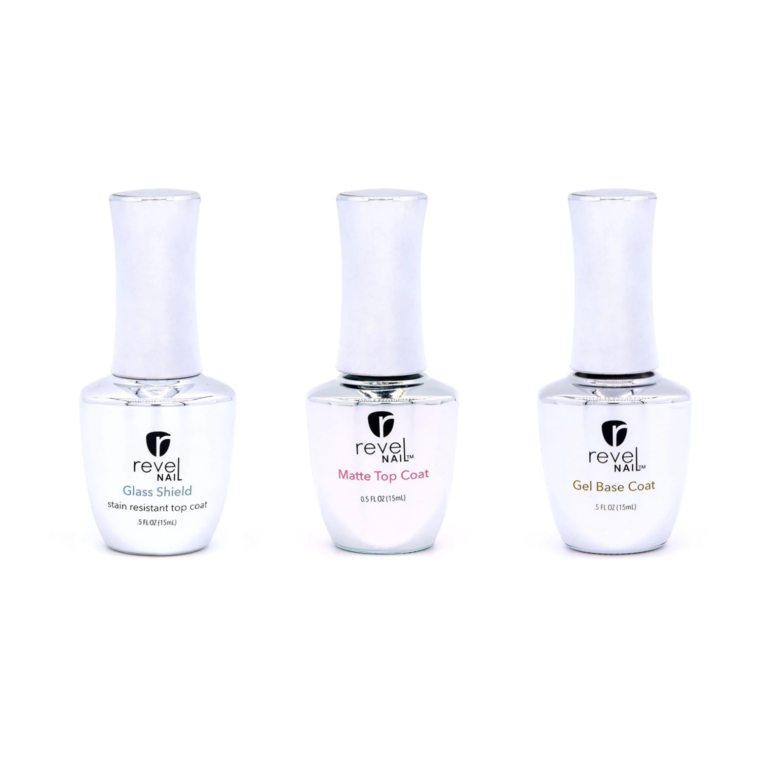 Get all of your gel liquids together! This bundle comes with one bottle of Glass Shield Top Coat, Matte Top Coat, and Gel Base.